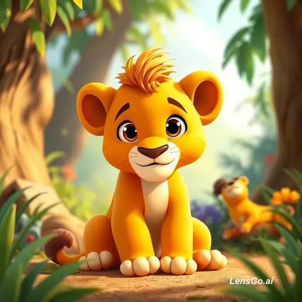 AI Image: 3D cartoon style cute baby lion sitting in colorful jungle, soft sunlight, big expressive eyes, chil