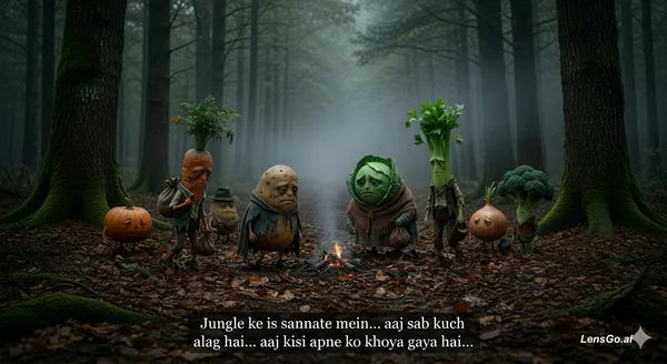 A dark cinematic forest clearing with anthropomorphic vegetable characters slowly gathering. Tall trees, fog drifting, dry leaves covering ground. Emotional mood, soft dim lighting, earthy tones, ultra-realistic, 4K. 🎙️ Dialogue (Hindi Voiceover): "Jungle ke is sannate mein... aaj sab kuch alag hai... aaj kisi apne ko khoya gaya hai..."