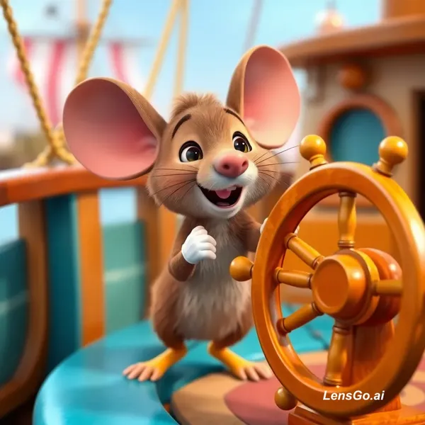 A small brown 3D mouse named Dinky, Pixar style, large ears, white gloves, yellow boots, whistling happily while steering a large wooden wheel on a colorful boat deck, vibrant colors, cinematic lighting, high detail.