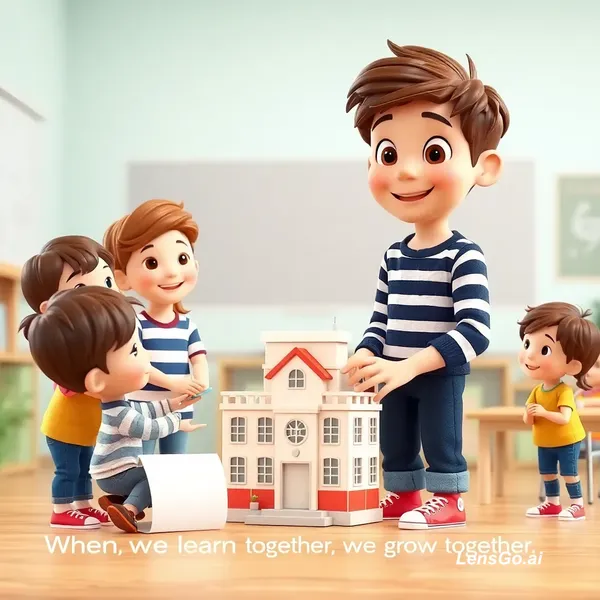 Same character in every scene: a cute 3D animated little boy teacher, around 7–10 years old, messy brown hair, big round expressive eyes, warm smile, light skin, wearing a navy-and-white striped long-sleeve shirt, cuffed dark blue jeans, and red sneakers with white laces. The boy teacher helps children work together on a classroom project, building a big paper model of a school and sharing supplies kindly. He teaches that education also means teamwork, listening, helping friends, and respecting others. The children smile, pass materials to each other, and solve problems together. Warm supportive classroom energy, soft cinematic movement, uplifting emotional storytelling, polished 3D animation.Optional voiceover line: “When we learn together, we grow together.”
