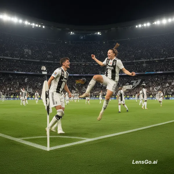 Genera immagini: Crea una foto con questi due ragazzi che sono giocatori della Juventus ed esultano per un gol fatto dalla ragazza all’ultimo minuto. Sono allo Juventus Stadium di sera. Togli gli occhiali alla ragazza. L’inquadratura deve essere un po’ dal basso come i giornalisti e vicino alla bandierina del calcio d’angolo. La ragazza falla che salta in aria ed esulta mentre il ragazzo la guarda esultare. Sullo sfondo devono vedersi i tifosi in curva e una porzione di campo da gioco.
