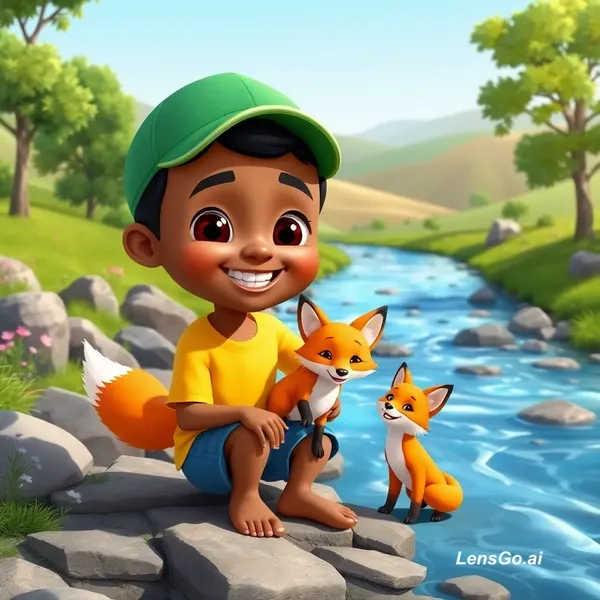 A high-quality 3D cartoon style illustration of a young Somali boy named Hirsi playing with his fox best friend near a clear flowing river. Hirsi has warm brown skin, big expressive eyes, short black hair, wearing a green cap, yellow t-shirt and blue shorts, barefoot and smiling happily. The fox is small, fluffy, bright orange with white chest and tail tip, playful and friendly. They are in a beautiful green landscape with trees, flowers, rocks, and soft sunlight. Background includes rolling hills.