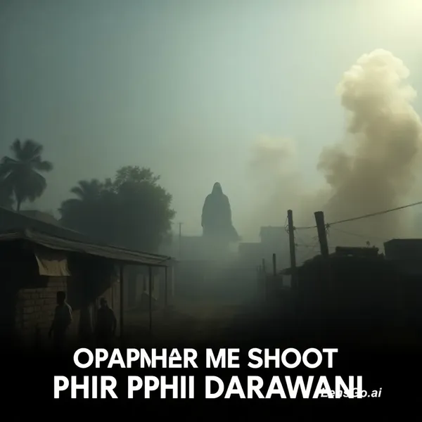 A horror cinematic thumbnail, village in daylight but creepy atmosphere, half bright sunlight and half dark shadow, a scary ghost silhouette in background, intense fear mood, realistic lighting, Indian rural setting, dramatic shadows, smoke and fog, high contrast, cinematic look, bold composition, space for text, ultra detailed, 9:16 aspect ratiobold hindi text: "DOPAHAR ME SHOOT PHIR BHI DARAWANI!"