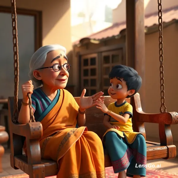 "An emotional 3D animation of an Indian grandmother sitting on a wooden swing (jhoola) with her little grandson. Warm sunlight, traditional Indian home setting. The grandmother is explaining something with hand gestures while the grandson looks at her with wonder. Soft cinematic lighting, high-quality textures, Pixar-style character design."