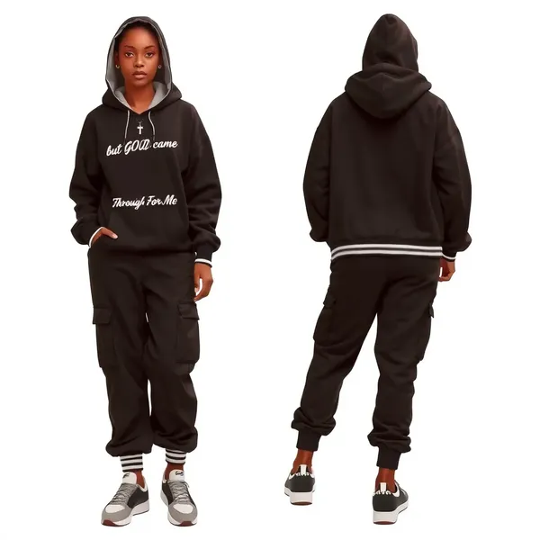 image réaliste et vivante d'une jeune fille noire de 23 ans en premier plan qui a une voix douce mais autoritaire portant : Voici les détails de sa tenue : Le haut Un sweat à capuche (hoodie) : Il est large . Détails : On voit trois bandes blanches le long des manches et une inscription blanche large à l'avant du hoodie: « but GOD came Through For Me » Accessoires : Elle porte un collier fin avec un petit pendentif en forme de croix. Le bas Un pantalon de jogging cargo : Très ample et large en bas (pattes d'eph/baggy). Détails : Il possède de grandes poches plaquées sur les côtés (style cargo) et les trois bandes blanches se prolongent sur les jambes avec un motif incurvé vers le bas. On remarque aussi un petit logo circulaire du crucifix blanc sur la cuisse gauche. Les chaussures Baskets blanches : Elle porte des chaussures de sport massives (type "chunky sneakers") entièrement blanches, qui contrastent avec la couleur jaune sombre de l'ensemble. Se tenant sur une montage qui surplombe un monde abusé avec dans la main une Bible rayonnante et une pancarte qui était à son côté gauche avec ce texte: JESUS CHRIST IS THE TRUTH