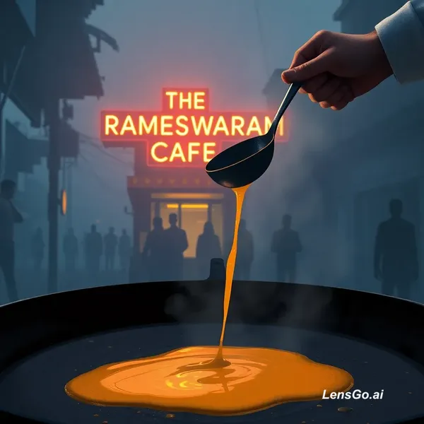 Scene 1: The Overture (Bangalore Dawn) Visual: A panoramic, low-angle shot of a Bangalore street at 5:30 AM. The scene is dominated by cool, blue-grey tones of dawn mist. In the middle distance, the warm, amber neon sign of "THE RAMESHWARAM CAFE" glows intensely, casting long shadows. A small, silhouetted queue of early risers is waiting. The art style is painterly and atmospheric. (Audio Sync - Script Scene 1): VO: "Bangalore wakes up in chapters. But at Rameshwaram, the story begins long before the sun is fully committed to the sky." Scene 2: The Choreography (The Ghee Flow) Visual: A tight, sophisticated close-up of a large, seasoned iron tawa (griddle). A chef’s hand (motion-blurred to suggest speed) holds a ladle, pouring a thick stream of molten, golden ghee that pools and sizzles instantly. The steam rises dynamically, illuminated by warm overhead lights. The focus is sharp on the liquid ghee. (Audio Sync - Script Scene 2): VO: "There is a specific kind of theater found here. It’s a high-stakes culinary ballet." Scene 3: The Star (The Ghee Podi Idli) Visual: An extreme close-up, macro shot. A single, super-soft Ghee Podi Idli sits submerged in a shallow pool of clear ghee. The coarse, red-orange podi (gunpowder spice) dusting is magnified, showing tiny textures. A delicate, elegant wisp of steam curls slowly upward from the center, catching the warm light. The background is completely blurred (bokeh). It looks minimalist and exquisite. (Audio Sync - Script Scene 3): VO