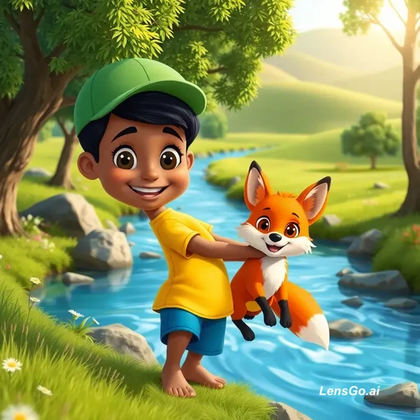 A high-quality 3D cartoon style illustration of a young Somali boy named Hirsi playing with his fox best friend near a clear flowing river. Hirsi has warm brown skin, big expressive eyes, short black hair, wearing a green cap, yellow t-shirt and blue shorts, barefoot and smiling happily. The fox is small, fluffy, bright orange with white chest and tail tip, playful and friendly. They are in a beautiful green landscape with trees, flowers, rocks, and soft sunlight. Background includes rolling hills.