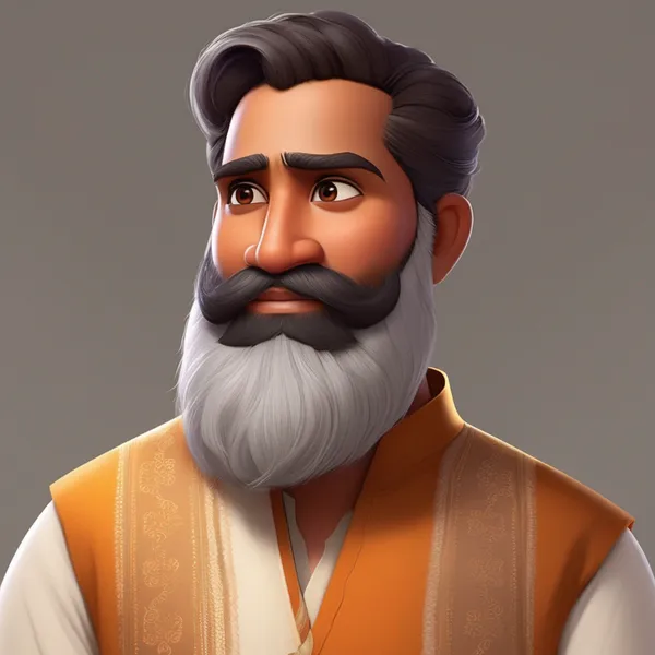 Disney Pixar style, stylized but clearly recognizable, preserve thick salt-and-pepper full beard, same hairstyle combed to the side, same facial structure, warm brown skin tone, expressive calm eyes. Do not change identity. He is wearing simple white traditional Indian kurta attire with saffron dupatta with soft fabric folds. Gentle peaceful expression. Gentle peaceful expression. White studio background, clean character sheet presentation
