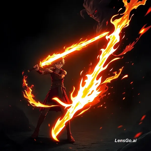 AI Image: A powerful anime warrior named Kaithal Raizen stands in a dark battlefield, holding a glowing fire s