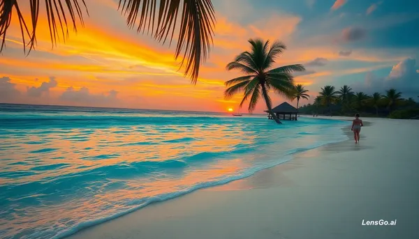 pristine tropical beach at golden hour, turquoise crystal clear water, palm trees swaying gently, cinematic sunset with orange and pink sky, professional travel photography. Wan to create a anime character
