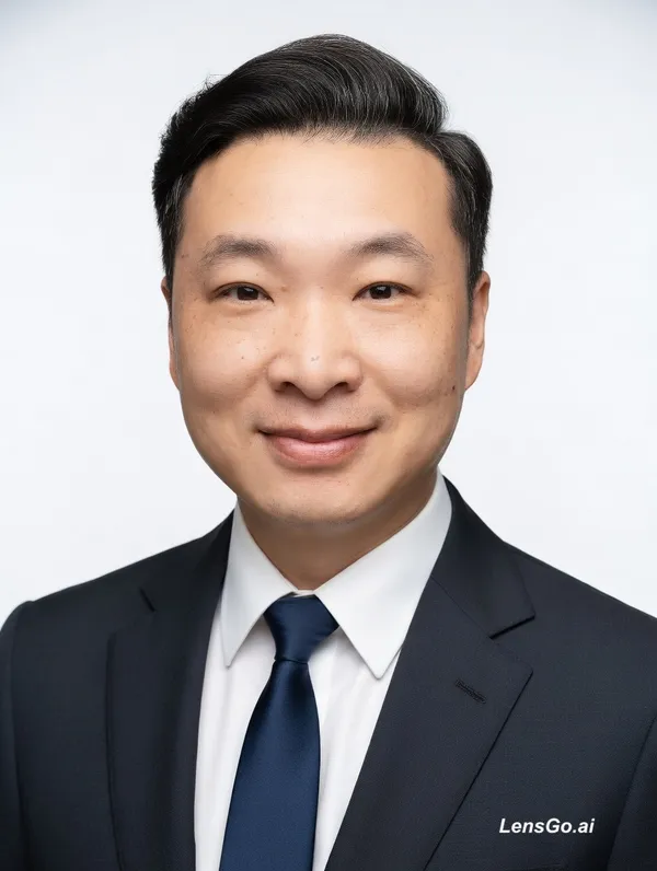 AI Image: 35-year-old Asian man, professional business attire, Apple-style clean background, confident look, h
