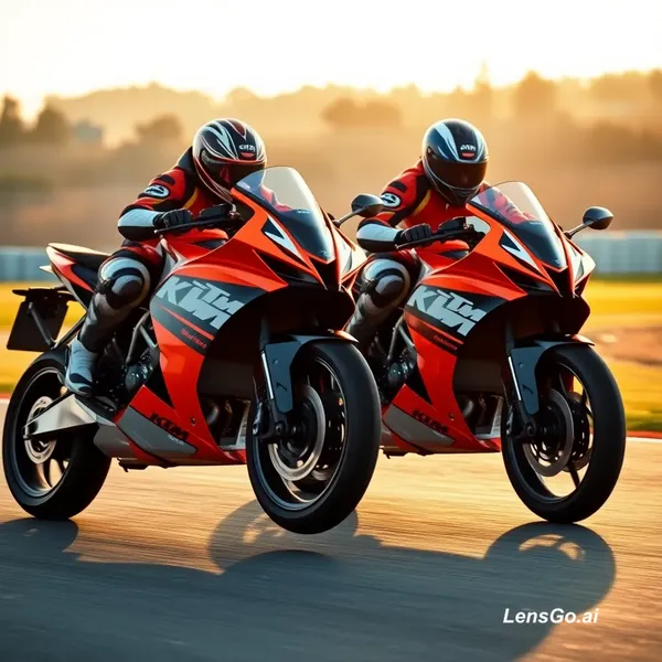 AI Image: Two KTM RC8 R sportbike riders performing synchronized wheelies on a racetrack, captured in golden h
