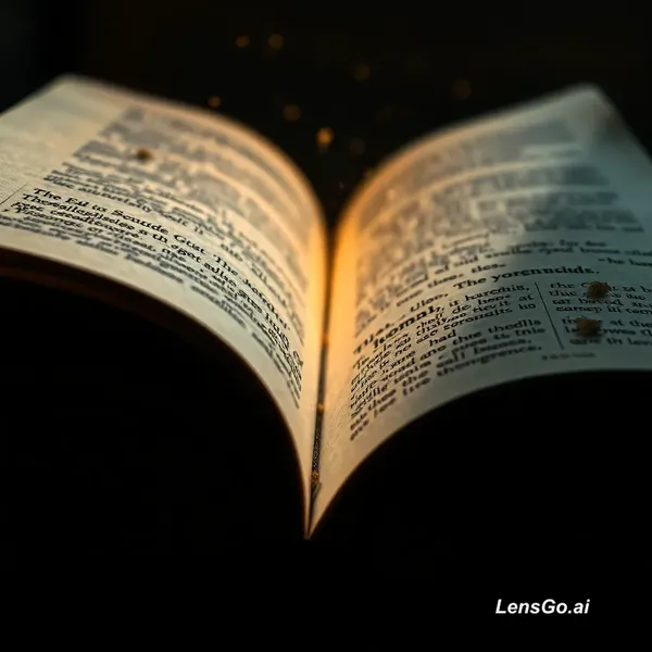 AI Image: Extreme close-up of an ancient weathered Bible, pages flipping open in slow motion, golden dust part