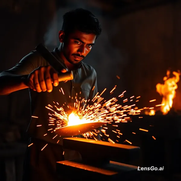 AI Image: A cinematic video of a young blacksmith (Shivan) in a rustic Kerala workshop. He is swinging a heavy