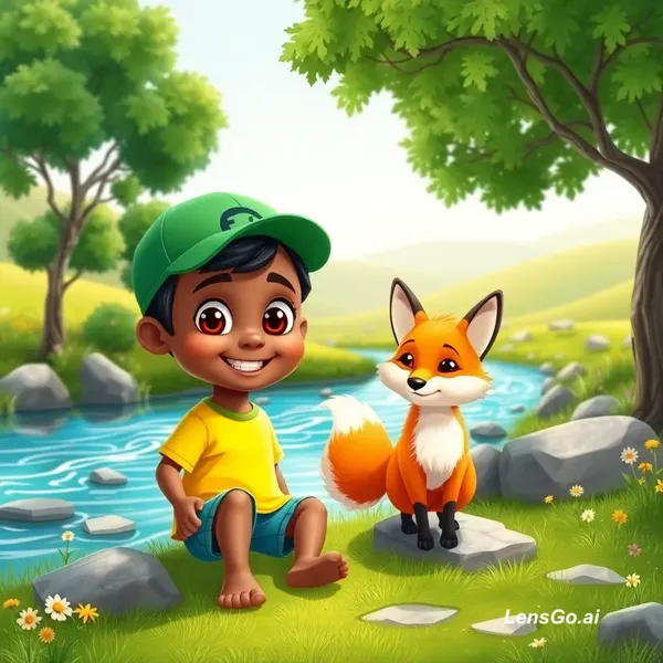 A high-quality 3D cartoon style illustration of a young Somali boy named Hirsi playing with his fox best friend near a clear flowing river. Hirsi has warm brown skin, big expressive eyes, short black hair, wearing a green cap, yellow t-shirt and blue shorts, barefoot and smiling happily. The fox is small, fluffy, bright orange with white chest and tail tip, playful and friendly. They are in a beautiful green landscape with trees, flowers, rocks, and soft sunlight. Background includes rolling hills.