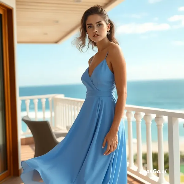 Please place the dress shown in the attached image on a realistic female model. The model should be standing on a balcony with an ocean view in the background. The scene should have a warm summer vibe with natural sunlight, soft shadows, and a luxury aesthetic. The model should look elegant and confident, with minimal styling to keep the focus on the dress. Make the final image look like a high-end fashion photoshoot.