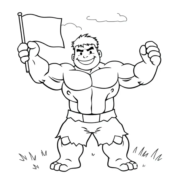 A simple black and white coloring page for kids of a big friendly superhero similar to Hulk, smiling and holding an Irish flag high in the air in one hand. The character should look strong but cartoonish and kid-friendly, with big muscles and a happy face. Clean bold outlines, minimal details, no shading, designed for easy coloring. The Irish flag waving proudly. Background simple with a few clouds and grass. Coloring book style, line art only, white background.