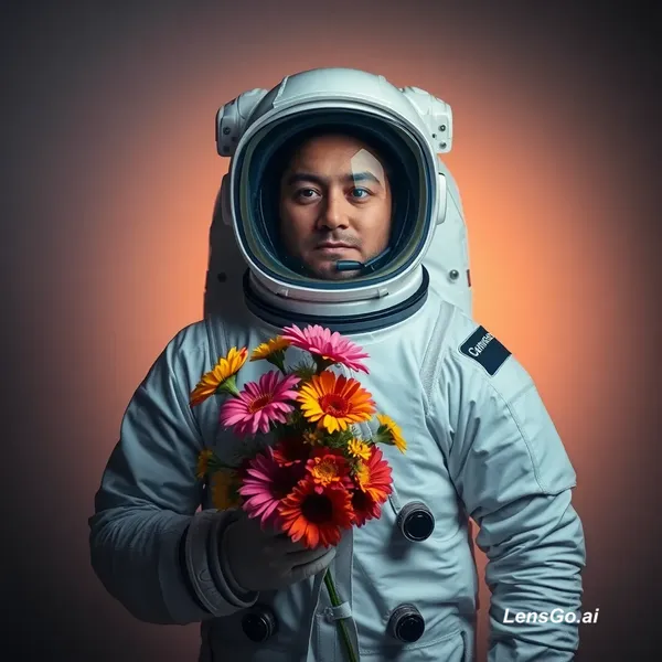 AI Image: Studio portrait of an astronaut holding flowers, dramatic lighting