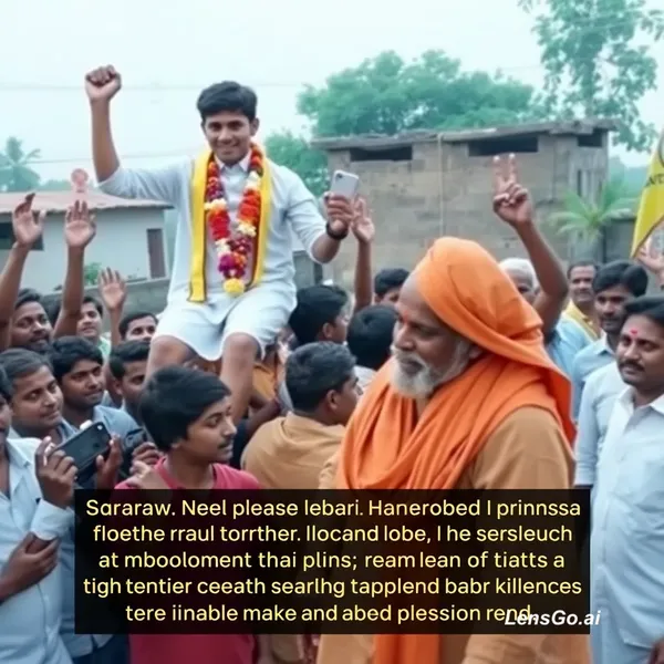AI Image: A satirical video showcasing a local political rally in an Indian village. A young man, wearing a wh