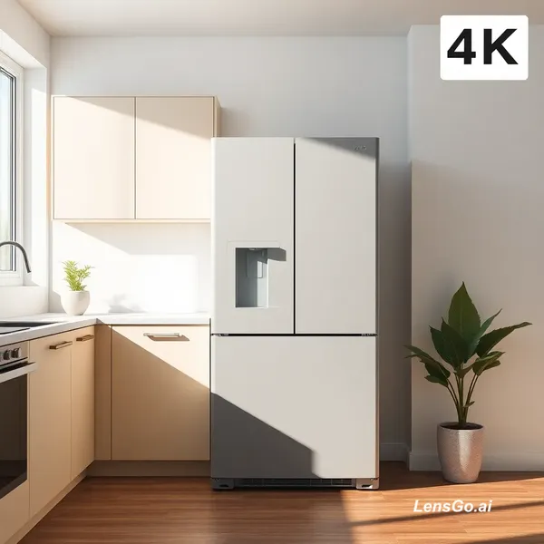 AI Image: A realistic product photo of a modern refrigerator placed in a stylish contemporary kitchen, minimal