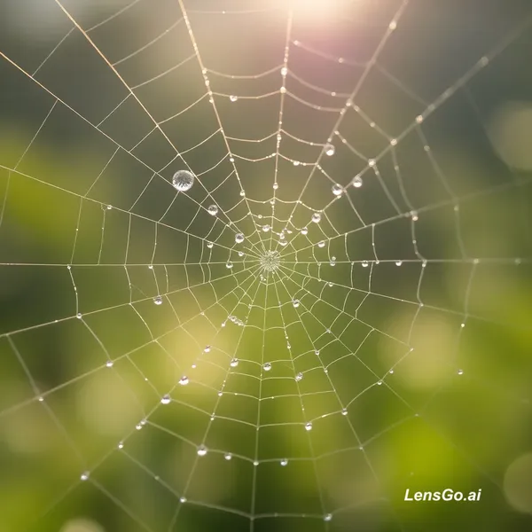 AI Image: Macro photograph of morning dew on spider web, bokeh background