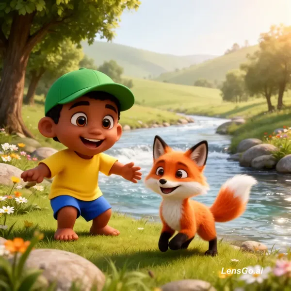 A high-quality 3D cartoon style illustration of a young Somali boy named Hirsi playing with his fox best friend near a clear flowing river. Hirsi has warm brown skin, big expressive eyes, short black hair, wearing a green cap, yellow t-shirt and blue shorts, barefoot and smiling happily. The fox is small, fluffy, bright orange with white chest and tail tip, playful and friendly. They are in a beautiful green landscape with trees, flowers, rocks, and soft sunlight. Background includes rolling hills.