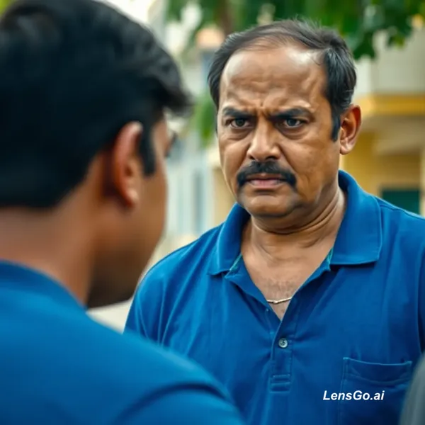 “Indian middle-aged man with short black hair and small mustache, wearing a blue polo t-shirt, standing outside in a residential street, serious expression on his face, talking angrily to someone in front of him, natural daylight, Indian TV serial style acting, emotional dialogue moment, realistic skin texture, cinematic camera close-up shot, shallow depth of field, ultra realistic, dramatic mood.”