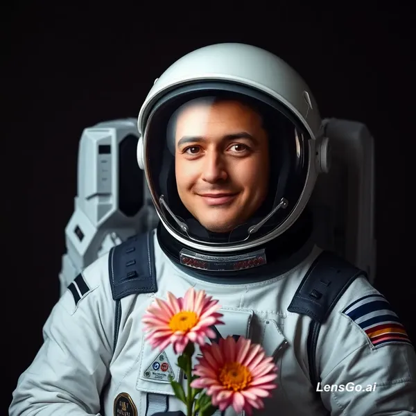 AI Image: Studio portrait of an astronaut holding flowers, dramatic lighting