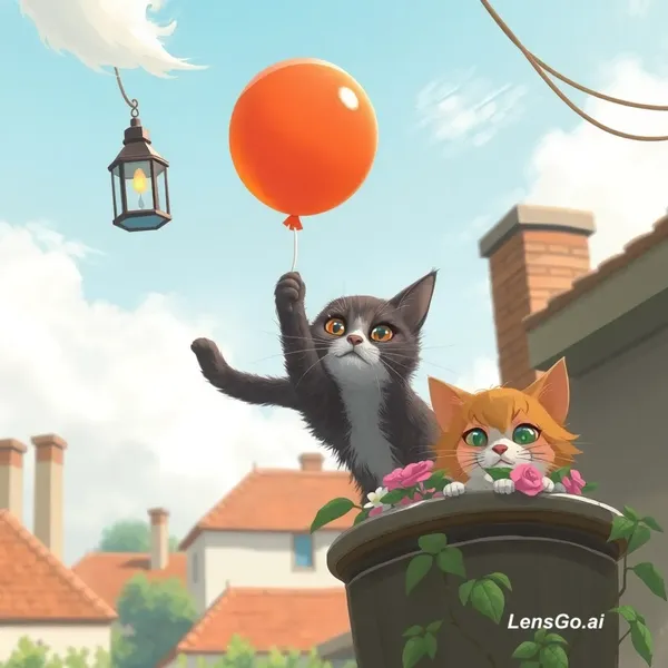 A gust of wind knocks a little girl’s balloon loose. The cat’s eyes widen. In a blur of motion, he leaps across rooftops, uses a hanging lantern as a swing, and launches himself skyward just in time to nudge the balloon back into her hands. She looks around, puzzled. The cat hides behind a planter, peeking out with a smug grin.