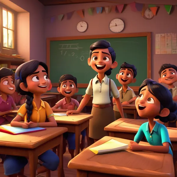 AI Image: Pixar style 3D cartoon scene of an Indian classroom, strict teacher standing near blackboard, backbe