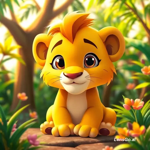 AI Image: 3D cartoon style cute baby lion sitting in colorful jungle, soft sunlight, big expressive eyes, chil
