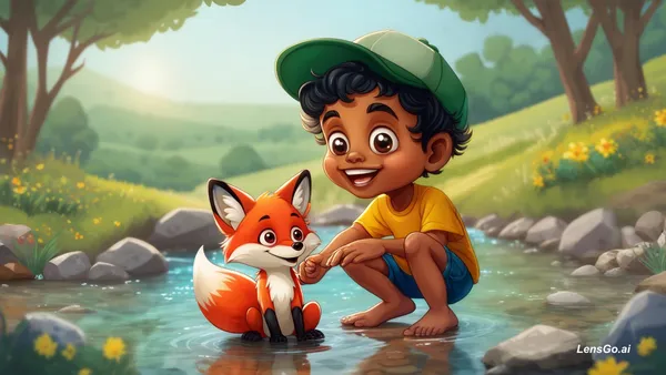 A high-quality 3D cartoon style illustration of a young Somali boy named Hirsi playing with his fox best friend near a clear flowing river. Hirsi has warm brown skin, big expressive eyes, short black hair, wearing a green cap, yellow t-shirt and blue shorts, barefoot and smiling happily. The fox is small, fluffy, bright orange with white chest and tail tip, playful and friendly. They are in a beautiful green landscape with trees, flowers, rocks, and soft sunlight. Background includes rolling hills., shot on modular 8K digital cinema camera, standard prime lens, 35mm standard natural perspective, f/1.4 shallow depth of field, creamy bokeh, professional cinematography, ultra-detailed, 8K resolution, film grain, cinematic color grading