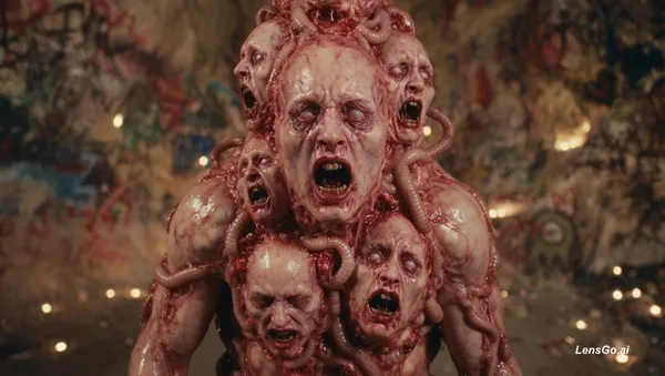 AI Image: "Extreme close-up of grotesque mutated flesh creatures, pale human-like skin fused with parasitic wo