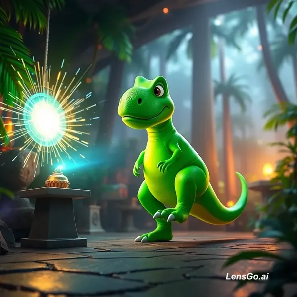 π¬ SCENE 1 β The Shrinking Moment (Hook) Prompt: A funny-looking bright green cartoon T-Rex named Rex, with smooth vibrant green scales, lighter green belly, big round expressive eyes, slightly oversized head, tiny arms, thick tail, and a goofy playful face, a talkative and highly expressive character mid-speech, standing inside a dense jungle laboratory filled with mysterious glowing elements and ancient stone technology, Rex pressing a glowing futuristic button on a small stone pedestal, the button emitting intense neon blue and green light, magical energy explosion radiating outward, shockwave of light particles and energy rings expanding, Rex beginning to shrink rapidly with magical distortion effect, his face showing extreme shock and humor as if shouting, glowing particles swirling around him, jungle trees towering in the background, cinematic fog, volumetric light beams, motion blur, dramatic lighting, depth of field focusing on Rexβs face, vibrant Pixar-style animation, ultra-detailed textures, whimsical and funny tone, Ultra-detailed 10K cinematic animation, Pixar-style 3D, volumetric lighting, depth of field, ultra-sharp focus, dramatic shadows, global illumination, highly detailed textures, soft cinematic glow, dynamic camera angles, shallow depth of field, expressive character, 8kβ10k resolution, high contrast, cinematic storytelling, hyper-realistic environment, no text, no watermark