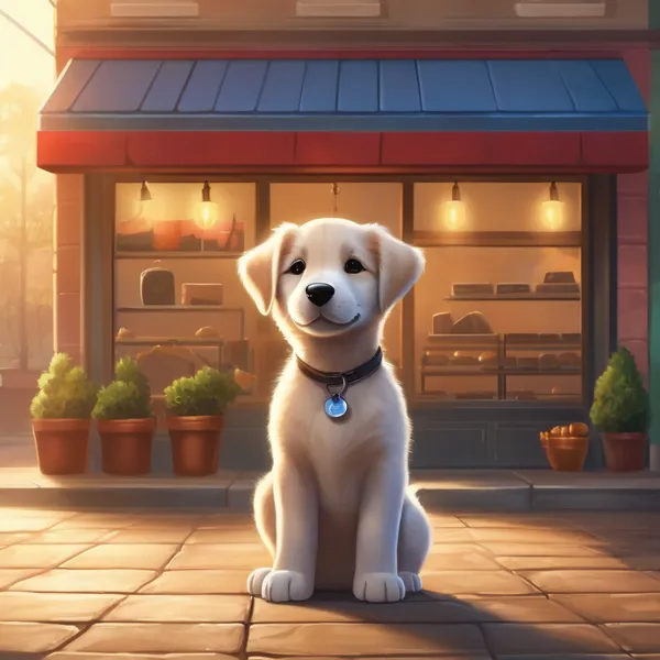 AI Image: Healthy puppy standing confidently in front of a shop, sunrise light, success after struggle theme,