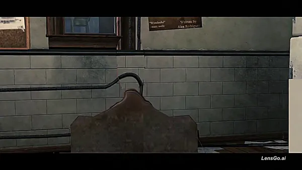 The padded backrest of a chair, against a gray tile wall with three black pipes in the background. Above the tiles, from the left, a wooden frame, then a wooden window, then a poster; to the right of the image, a white refrigerator can be glimpsed. Use a realistic style, while maintaining the original image's representation. Make sure the image's elements overlap with those of the original.