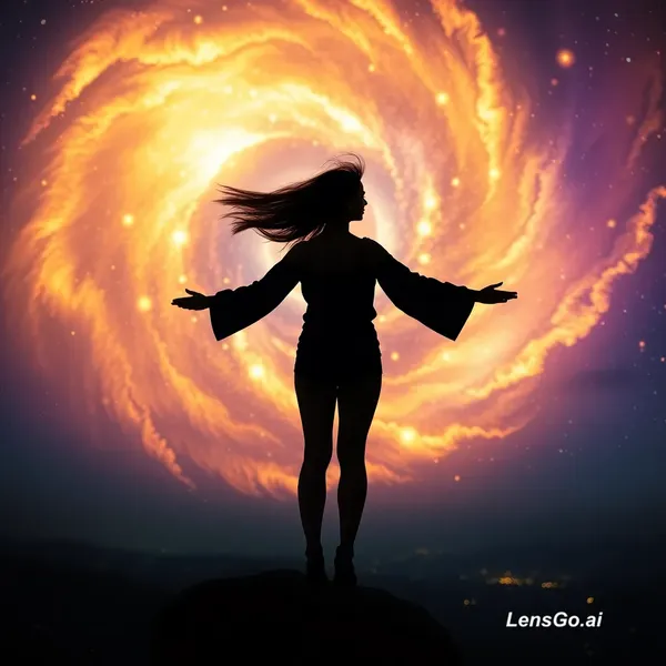 Wide cinematic shot - women stands on a cliff edge or rooftop at night, arms slightly open, wind blowing through her hair. The sky behind her explodes into swirling golden and violet light, like a galaxy awakening. Her silhouette glows at the edges. Epic, emotional, breathtaking. Slow push-in camera movement.
