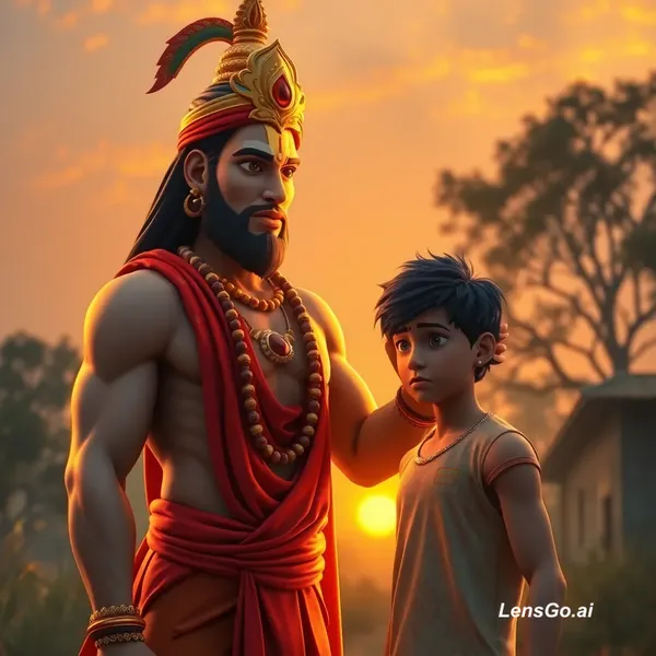 AI Image: A powerful divine scene of Lord Hanuman standing beside a sad teenage boy in a quiet village at suns