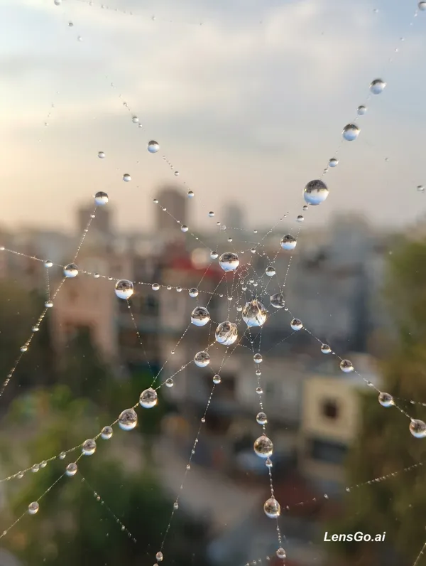 AI Image: Macro photograph of morning dew on spider web, bokeh background