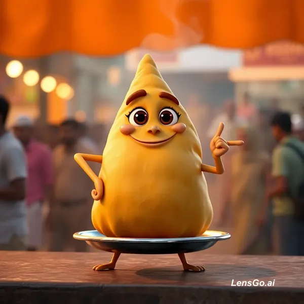 Pixar-style 3D render of a golden, crispy samosa standing upright on a small steel plate. Eyes: warm, expressive almond-shaped eyes with a confident sparkle Eyebrows: slightly arched in pride Mouth: cheeky half-smile with a tiny smirk of spice Arms: one hand on hip, the other pointing dramatically like it’s making a bold statement Legs: tiny sturdy legs planted firmly Scene: Bustling Indian street food stall at sunset, warm orange glow, steam rising in slow motion, blurred crowd in the backgroun