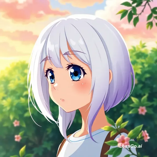 AI Image: Create a picture of an anime character with white and purple hair at the ends, blue eyes, and a beau