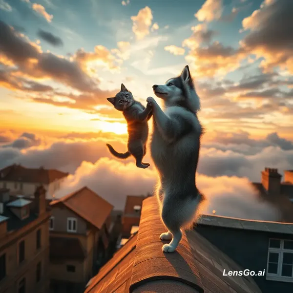 Cinematic aerial top shot looking down from the sky. The camera rapidly descends through the clouds towards a rooftop in a vintage European city during sunset. On the rooftop, a fluffy husky dog and a small gray cat are standing on their hind legs, dancing together gracefully. The cat twirls under the dog's arm. Warm golden hour lighting, soft shadows, slow motion, hyper-realistic, 8k resolution, film grain texture.