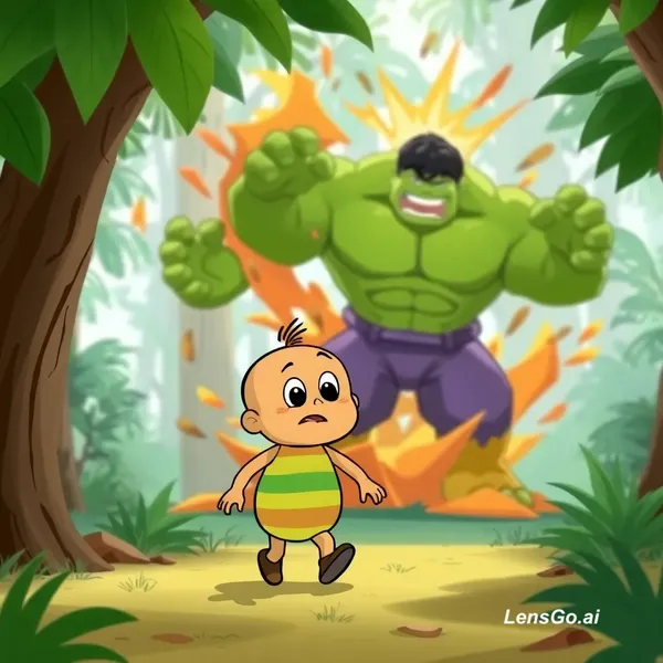 AI Image: Funny cartoon character Patlu walking slowly through the jungle, suddenly seeing Hulk smashing trees
