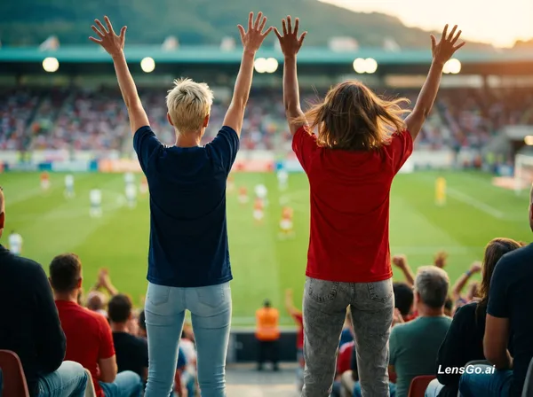 Realistic photograph. Portrait format. Two female soccer fans attending a soccer game. They're standing in the aisle and cheering with their arms in the air (fingers spread open, NOT clenched). Both women should be slightly standing on the toes as if jumping up in excitement. Make their postures slightly different. The shirt tails are NOT tucked in - they are seen full length and extend mid-way down the hips. They're wearing jeans (one stone-washed gray jeans, one light blue tight jeans), are about 35 yrs old, one has short sassy pixie haircut, blonde. The other has shoulder length mid-brown hair that's being whooshed gently by a breeze. Different skin colors on both. Viewpoint: they're seen from the back. mid-level at a crowded stadium. Visible in the background is the soccer field. Except for the two soccer fans, the entire scene is somewhat blurry yet clear enough to see the context of the scene. The ambiance is radiant, upbeat, exciting, illuminated.