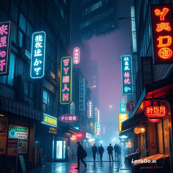 AI Image: Cyberpunk street market in the rain, neon signs and steam rising