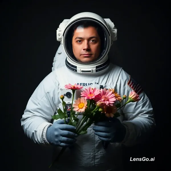 AI Image: Studio portrait of an astronaut holding flowers, dramatic lighting