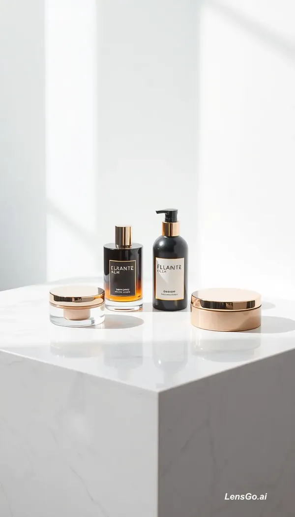 AI Image: Luxury product photography on white marble surface, soft studio lighting, minimal composition, premi