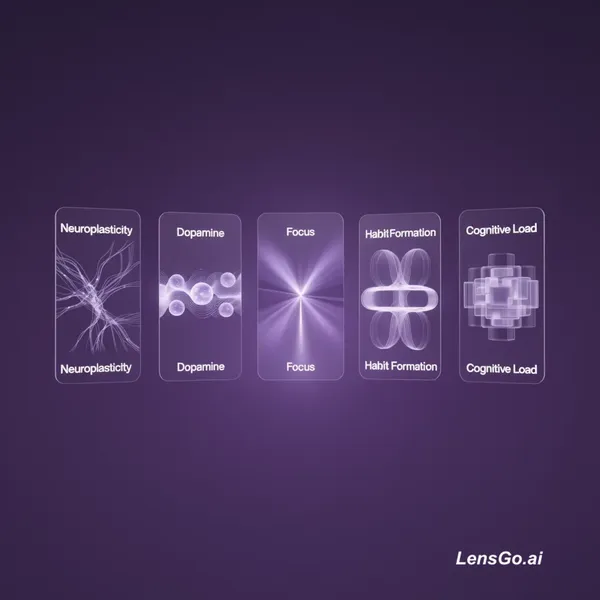 AI Image: Minimalist cinematic UI animation with five centered glassmorphic cards: Neuroplasticity, Dopamine,