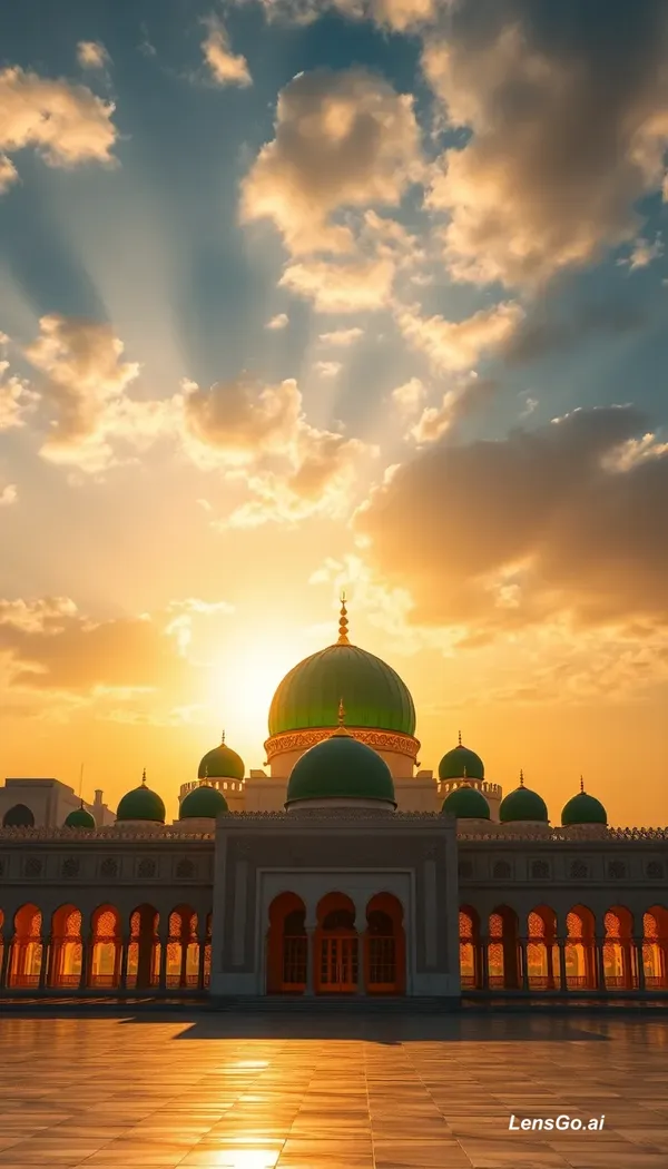 AI Image: Ultra realistic 4K thumbnail of Masjid an-Nabawi Madina Sharif, beautiful green dome glowing in gold