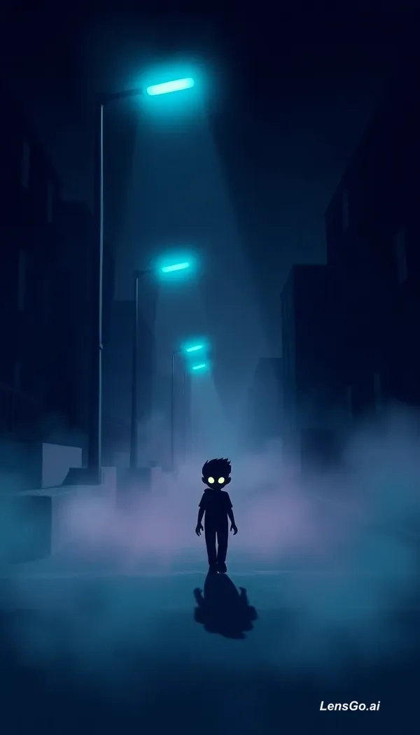 bold dark cartoon horror scene, stylized illustration, not realistic. A lone character walking through a foggy abandoned street at night. Exaggerated proportions, slightly distorted silhouette, glowing faint eyes. Thick fog covering the ground. Streetlights emit unnatural teal glow, flickering. High-contrast lighting with deep shadows and sharp highlights. Cartoon-style outlines, painterly shading, dramatic cinematic composition. Background buildings simplified and stylized. Eerie atmosphere with subtle surreal elements, like shadows stretching unnaturally. Moody blue and green tones, strong stylization, creepy animated horror look.